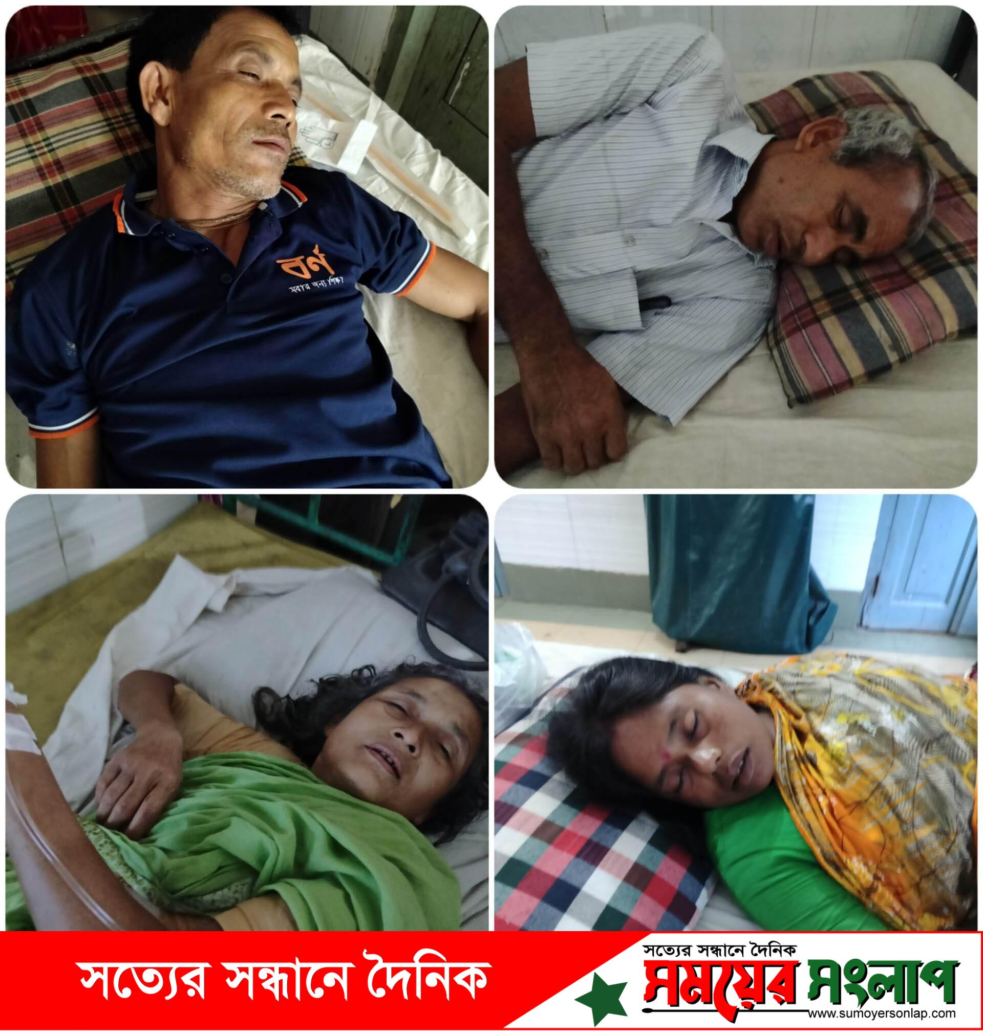 আহতরা হলেন ওই এলাকার গনেশ চন্দ্রের ছেলে র্নিমল চন্দ্র (৪৫)তার স্ত্রী পিতিলতা (৩৮) র্নিমল চন্দ্রের ছেলে স্বপন চন্দ্র (৫০) ও তার আত্বীয় চিনুবালা (৫৫)। তারা রাতে খাবার খেয়ে সকালে অচেতন হয়ে পড়েন। পরিবারের সদস্যরা তাদেরকে স্বাভাবিক করার জন্য অনেক চেষ্টা করেছেন । কিন্তু ঘুমে বিভোড় হয়ে পড়ে তাঁরা। বিকাল ৩টার দিকে ফুলবাড়ী হাসপাতালে ভর্তি করা হয় তাদেরকে।
