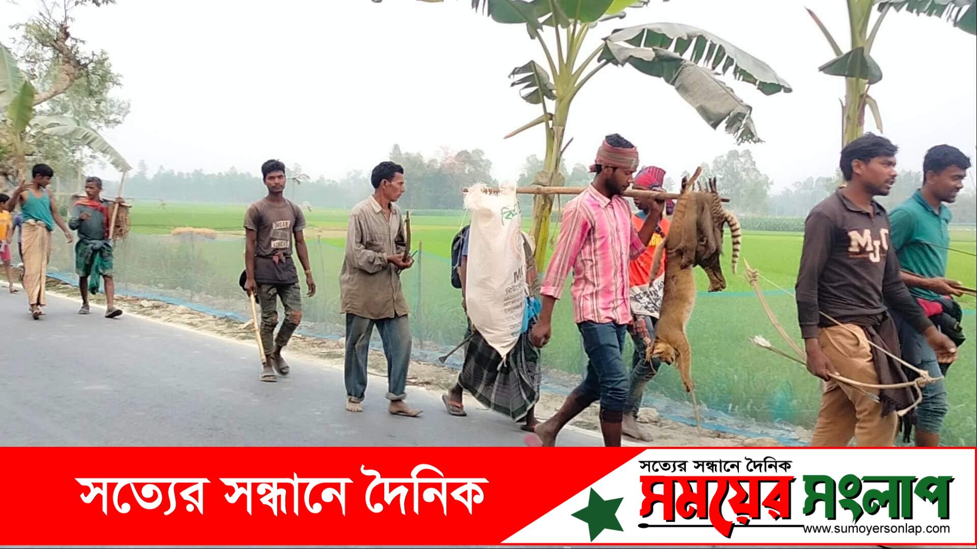 প্রত্যক্ষদর্শী বাবুল হোসেন, মজিদুল হক, বাদশা মিয়া জানান, সাঁওতালরা ১৩ জন মিলে একটি ক্ষেত চারদিক থেকে ঘিরে ফেলে। এরপর ২/৩ জন ওই ক্ষেতের ভিতর ঢুকে দৈঘ্য- প্রস্থে যাওয়া আসা করে। এতে ক্ষেতের ভিতর লুকিয়ে থাকা বন্য প্রাণিরা প্রাণ ভয়ে এদিক সেদিক ছুটাছুটি করতে থাকে। তখন সাঁওতালরা তীর বা বল্লম ছুঁড়ে প্রাণিদের শিকার করে। তারা আরও জানান, শেয়াল,বেজি, বনবিড়াল ও বাগডাসা মিলে আজ সারা দিনে তারা পঞ্চাশটিরও বেশি বন্যপ্রাণি শিকার করেছে।
