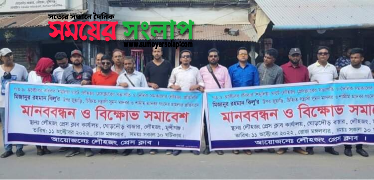 দৈনিক সমকালের লৌহজং প্রতিনিধি ও লৌহজং প্রেসক্লাবের সভাপতি মিজানুর রহমান ঝিলুর উপর গত ৯ অক্টোবর মুন্সীগঞ্জের লৌহজং উপজেলার শিমুলিয়া ঘাটে সংবাদ সংগ্রহ করতে গিয়ে জুয়াড়ি ও মাদকব্যবসায়ী সুমন মাদবর গংদের হামলা ও হত্যার চেষ্টার প্রতিবাদে ও আসামী গ্রেফতারের দাবিতে মানববন্ধন করেছে লৌহজং প্রেস ক্লাব।