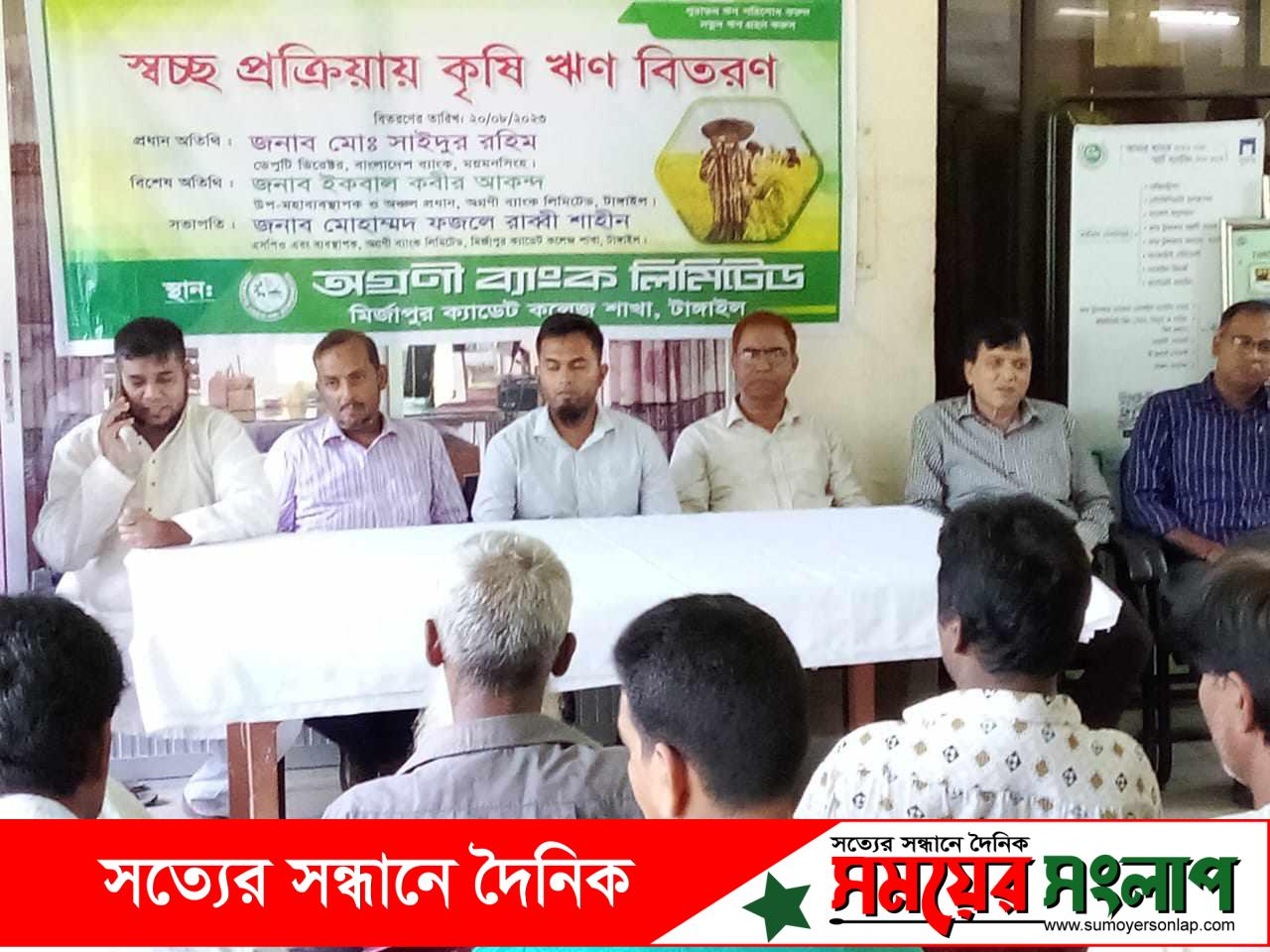 টাংগাইল মির্জাপুরে অগ্রণী ব্যাংক লিমিটেড মির্জাপুর ক্যাডেট কলেজ শাখায় স্বচ্ছ প্রক্রিয়ায় কৃষি ঋণ বিতরণ করা হয়েছে ।২০ শে আগস্ট ২০২৩ খ্রিস্টাব্দ রবিবার ১২ ঘটিকার সময় এই ঋণ গুলো বিতরণ করা হয়েছে ।অগ্রণী ব্যাংক লিমিটেড মির্জাপুর ক্যাডেট কলেজ শাখা ব্যবস্থাপক জনাব মোহাম্মদ ফজলে রাব্বী শাহীনের সভাপতিত্বে প্রধান অতিথি হিসেবে উপস্থিত ছিলেন জনাব মোঃ সাইদুর রহিম ,ডেপুটি ডাইরেক্টর বাংলাদেশ ব্যাংক ময়মনসিংহ ।