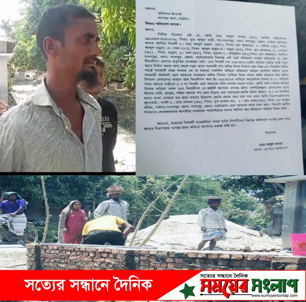 নাটোরের লালপুরে ক’ তফসিলের ১ নং খাস খতিয়ান ভুক্ত ভূমিতে জনসাধারণের চলাচলের রাস্তা বন্ধ করে অবৈধভাবে জমি দখল করে বিল্ডিং নির্মাণের কাজ শুরু করেন আব্দুল হান্নান মিয়া। উক্ত জমি ১নং খতিয়ান ভুক্ত হওয়ায় গোপন সূত্রে খবর পান ভূমি সহকারী কর্মকর্তা খবর পেয়ে তাৎক্ষণিকভাবে ভেলাবারিয়া ইউনিয়ন ভূমি অফিসের অফিস সহকারি উজ্জল হোসেনকে ঘটনাস্থল পরিদর্শনে পাঠান সরোজমিনে গিয়ে দেখা যায় উক্ত জমিতে আব্দুল হান্নান সহ বেশ কয়েকজন নির্মাণ শ্রমিক নিয়ে দ্রুত গতিতে নির্মাণ কাজ করতে দেখেন পান উজ্জল পরে জমিন সীমানা নির্ধারণ করতে বললে অপারগতা স্বীকার করেন আব্দুল হান্নান মিয়া বিষয়টি এলাকাবাসীর নজরে আসলে সীমানা চিহ্নিতকরণের জন্য আবুল বাশার কে বলেন অফিস সহকারি উজ্জল জমির সীমানা পিলার দেখানোকে কেন্দ্র করে দেশীয় অস্ত্র হাতে নিয়ে তেরে আসেন হান্নান, মানিক, ও,নয়ন। হত্যার হুমকি দিয়েছে প্রতিপক্ষ হান্নান ও তার লোকজন অফিস সহকারী উজ্জলের সামনেই দেশীয় অস্ত্র হাতে নিয়ে আসেন তারা