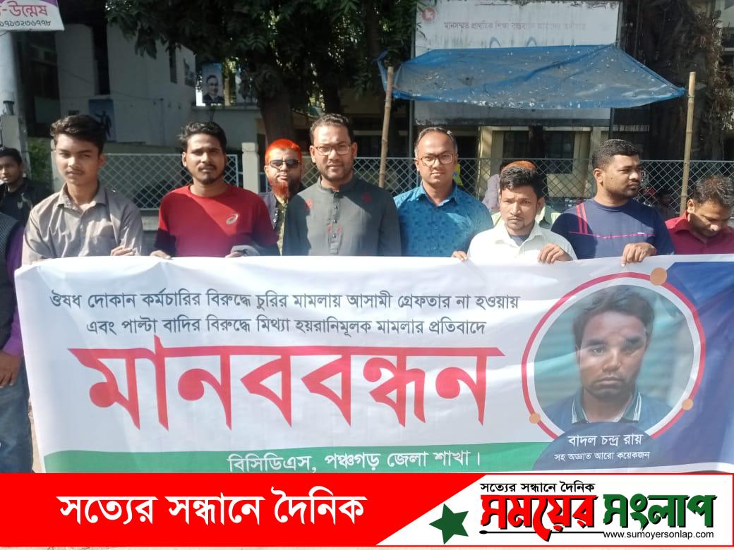 পঞ্চগড়ে ঔষুধ ব্যবসায়ীদের মানববন্ধন: আসামি গ্রেফতারের দাবিতে দোকান বন্ধ