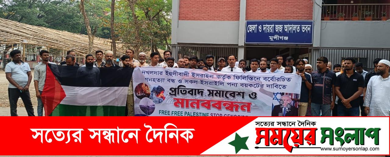 ফিলিস্তিনে ইসরাইলিদের বর্বোরচিত গণহত্যা, হামলা বন্ধ ও সকল ইসরাইলি পণ্য বয়কটের দাবিতে মুন্সীগঞ্জ জেলা আইনজীবী সহকারী সমিতির ব্যানারে প্রতিবাদ সভা ও মানববন্ধন করা হয়েছে।