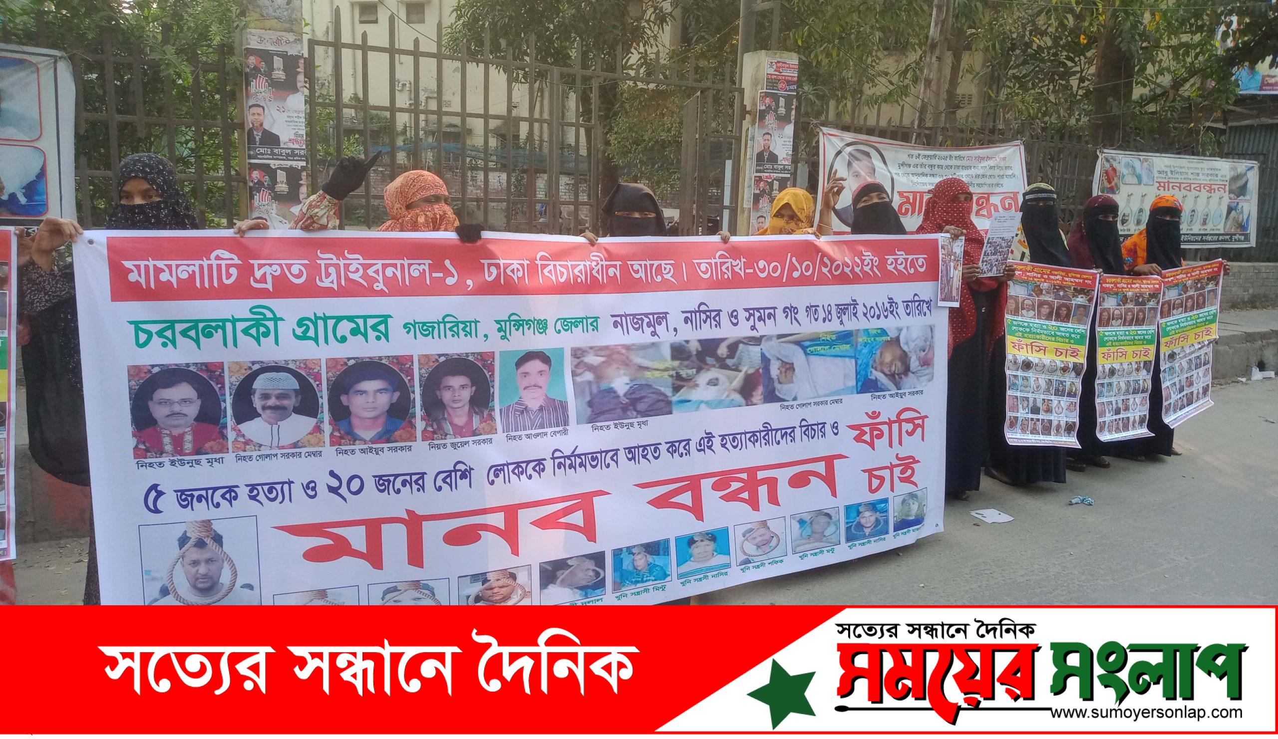 মুন্সীগঞ্জের গজারিয়ার চরবলাকি গ্রামে আলোচিত ফাইভ মার্ডারের ঘটনার আসামীদের বিচারের দাবিতে মানববন্ধন করেছে নিহতের স্বজন ও এলাকাবাসী।