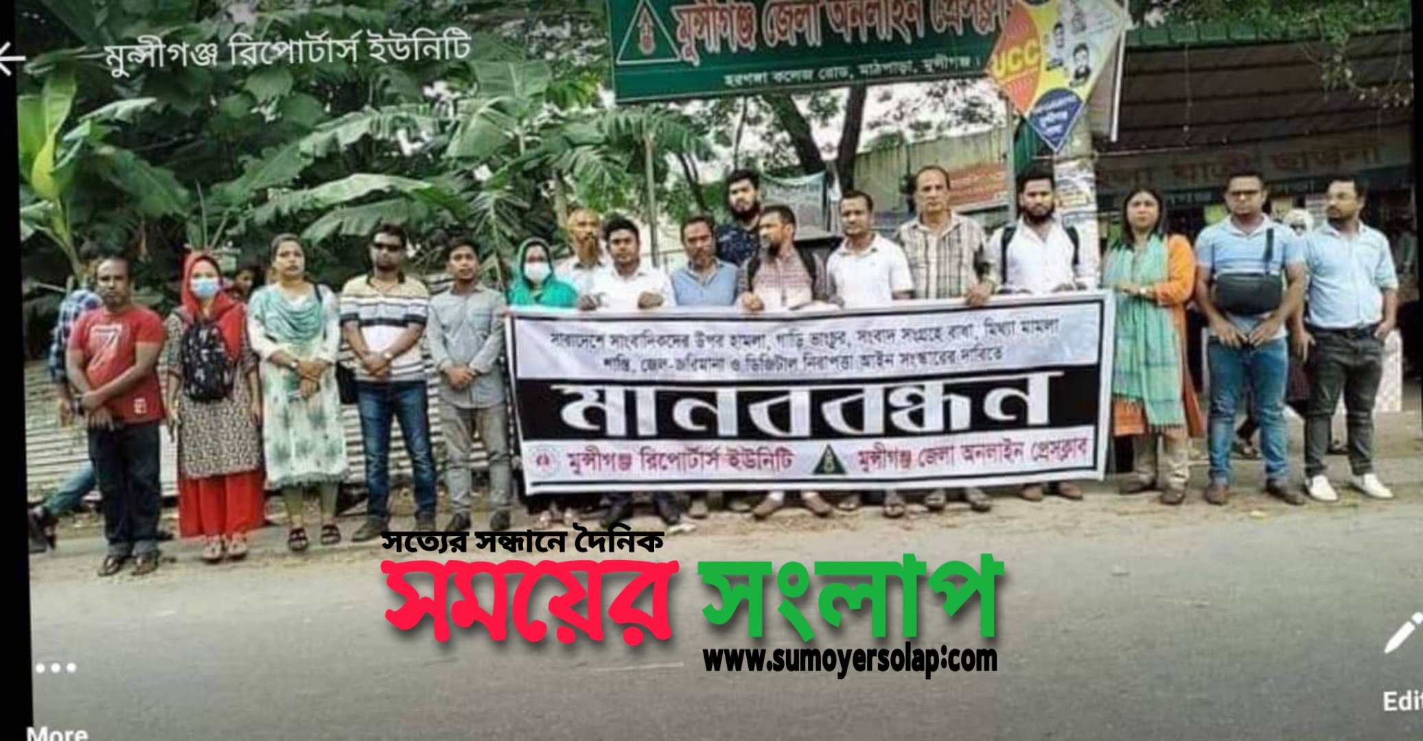 সারাদেশে সাংবাদিকদের উপর হামলা,গাড়ি ভাঙচুর, সংবাদ সংগ্রহে বাধা, মিথ্যা মামলার শাস্তি, জেল-জরিমানা ও ডিজিটাল নিরাপত্তা আইন সংস্কারের দাবিতে ২৬শে সেপ্টেন্বর সোমবার বেলা ১১টা ৩০ মিনিটে মুন্সিগঞ্জ জেলা অনলাইন প্রেস ক্লাবের সামনে এ মানববন্ধন অনুষ্ঠিত হয়। মুন্সীগঞ্জ জেলা অনলাইন প্রেসক্লাব ও মুন্সীগঞ্জ রিপোর্টার্স ইউনিটির আয়োজনে সাংবাদিকদের উপর হামলার প্রতিবাদে এই মানববন্ধন অনুষ্ঠিত হয়েছে। মুন্সীগঞ্জ জেলা অনলাইন প্রেসক্লাবের সভাপতি কাজী বিপ্লব হাসানের সভাপতিত্বে ও সাধারণ সম্পাদক জাহাঙ্গীর আলমের সঞ্চালনায় মানববন্ধনে উপস্থিত ছিলেন মুন্সিগঞ্জ জেলা অনলাইন প্রেসক্লাবের সাবেক সভাপতি শামসুল হুদা, সোহাগ চোকদার, আনিছুর রহমান রলিন, লিটন মাহমুদ,তুষার আহম্মেদ ,সাইদুল ইসলাম, সালমান হাসান, মোঃ ফয়সাল, নাসিমা আক্তার রিতা, রুপা বেগম, মিনহাজুল ইসলাম,মুন্সীগঞ্জ রিপোর্টার্স ইউনিটির সাংগঠনিক সম্পাদক শাহনাজ বেগম, কোষাধ্যক্ষ ফরহাদ হোসেন, দ্য হেলমেট প্ল্যাটফর্মের সভাপতি রুনা আক্তার ছোঁয়াসহ অন্যান্য সাংবাদিকবৃন্দ।