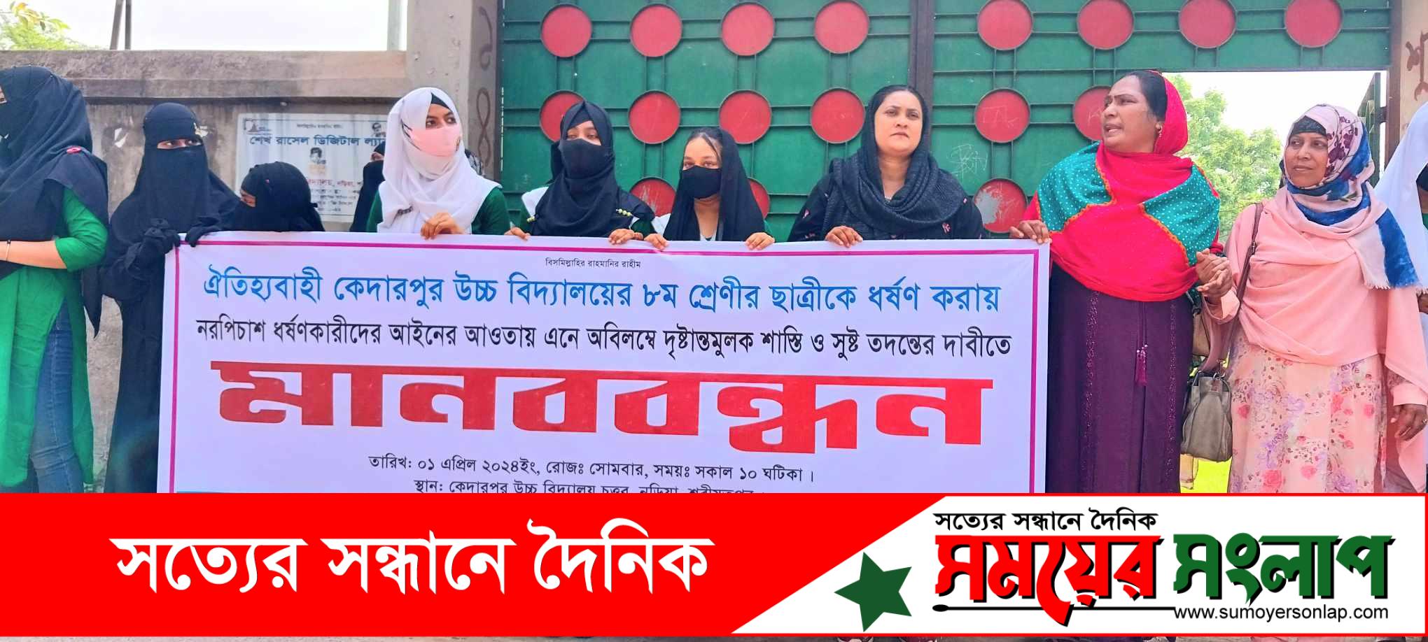 শরীয়তপুরের নড়িয়া উপজেলার কেদারপুর উচ্চ বিদ্যালয়ের ৮ম শ্রেণীর ছাত্রীকে ধর্ষণের অভিযুক্ত ইউপি সদস্য ও শিক্ষকদের বিচারের দাবীতে মানবন্ধন করেছে শিক্ষার্থী ও এলাকাবাসী। সোমবার (০১ এপ্রিল) সকাল ১০টায় স্কুলের সামনে এ মানবন্ধন অনুষ্ঠিত হয়।