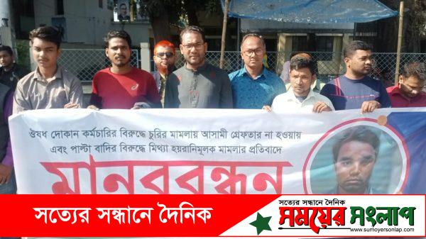 পঞ্চগড়ে ঔষুধ ব্যবসায়ীদের মানববন্ধন: আসামি গ্রেফতারের দাবিতে দোকান বন্ধ