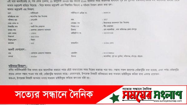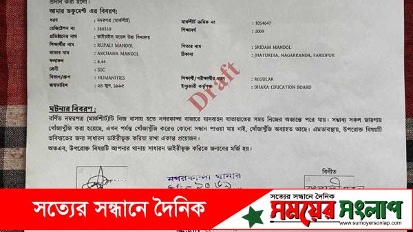 নিজস্ব প্রতিবেদকঃ আমার এসএসসি পরীক্ষা ২০১১ইং মূল মার্কশিট ক্রমিক নং ১০৫৪৬৪৭, রোল নং ২৩৫২৭৭, রেজিঃ নং ২৮০৩১৯, শিক্ষাবর্ষ ২০০৯ইং এর মূল মার্কশিট গত ১৪/০৯/২০২৩ইং হারিয়ে গিয়েছে। নগরকান্দা থানার জিডি নং